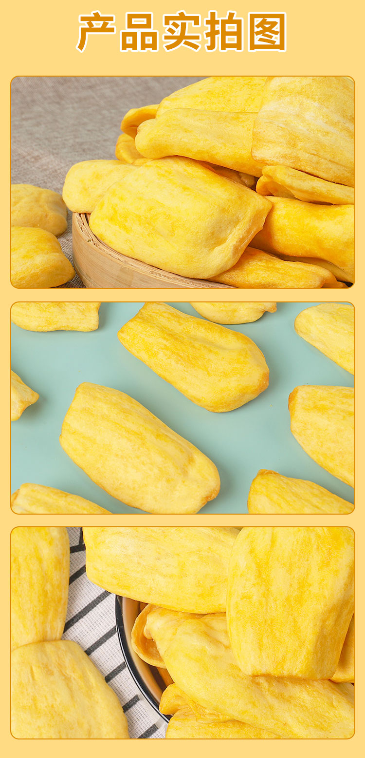 菠蘿蜜脆采用新鮮菠蘿蜜果肉為原料,經(jīng)過精心制作而成。其口感酥脆,味道香甜,,讓人回味無窮,是一款美味的零食。